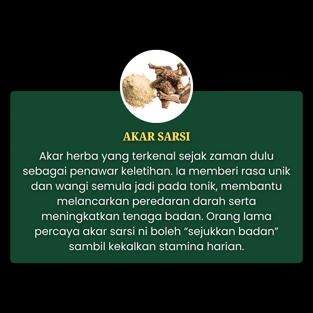 Rasanya tak beberapa kelat, tapi rasa sarsi kerana dari Akar Sarsi Asli.